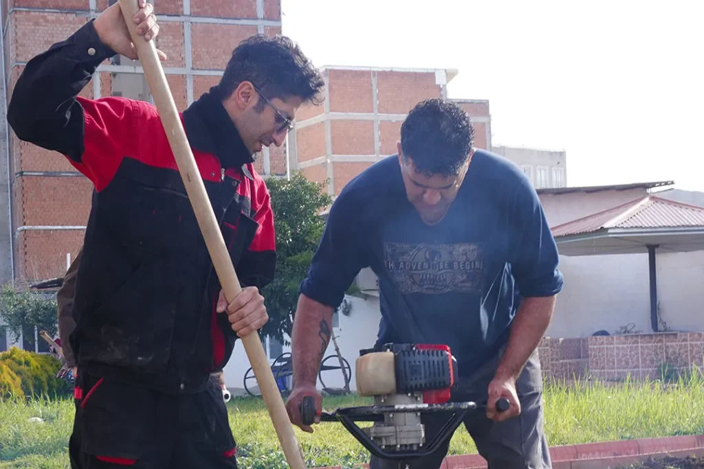 حیاط مجموعه فضایی داشت که ظرفیت تبدیل شدن به یک محیط سبز و دلنشین را داشت. با همکاری تیم اجرایی، چالههای لازم حفر شد و نهالها به محل منتقل شدند. فضای ساده حیاط، کمکم رنگ و بوی زندگی به خود گرفت.